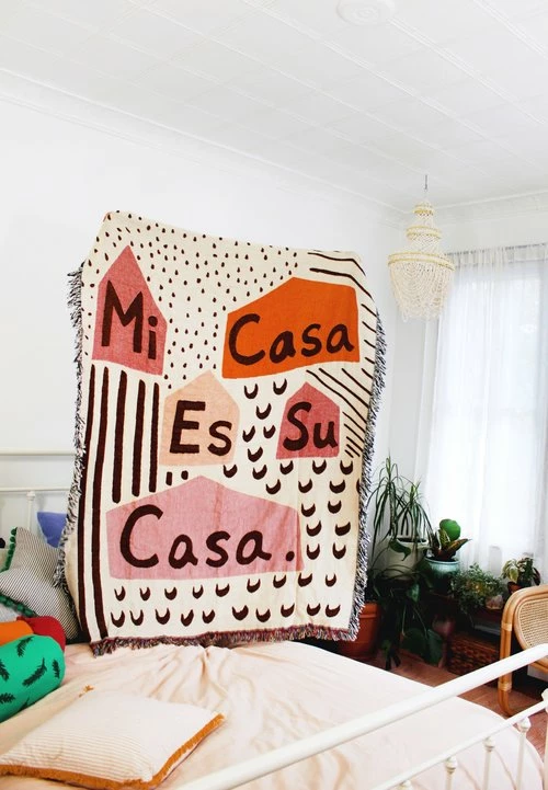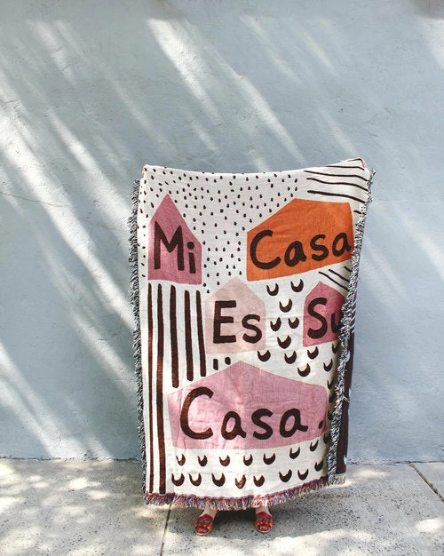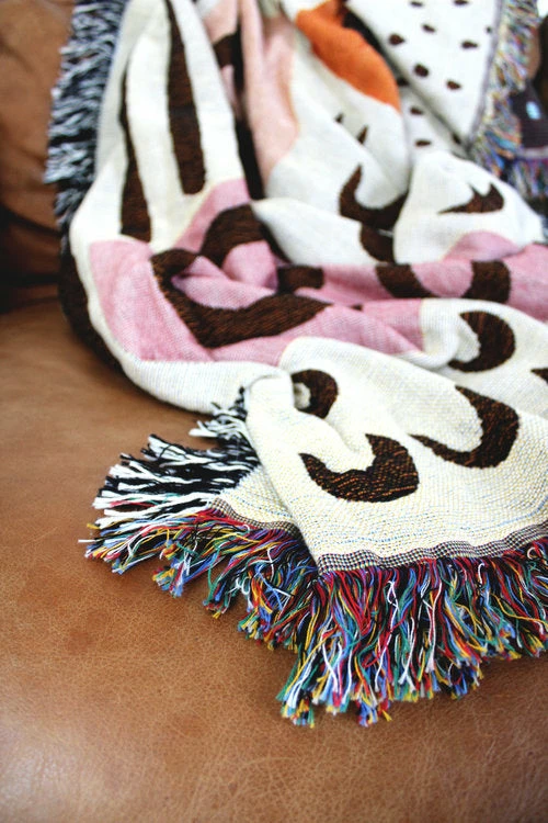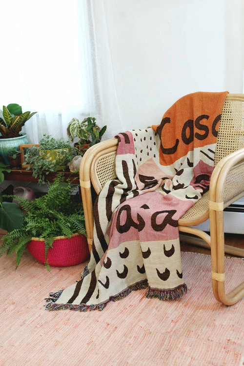 50″x68″ not including fringe. 100% Cotton. Machine wash cold, tumble dry low.