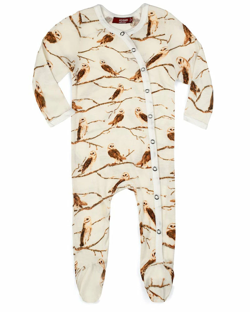 This newborn and baby bamboo Snap Footed Romper in the Owl print blends design with functionality. With a closed foot detail, contrasting cuffs, and a stylized off-center seam, this timeless classic will envelop our little ones in soft and gentle comfort. The ring-snap closures allow for ease of changing and dressing.