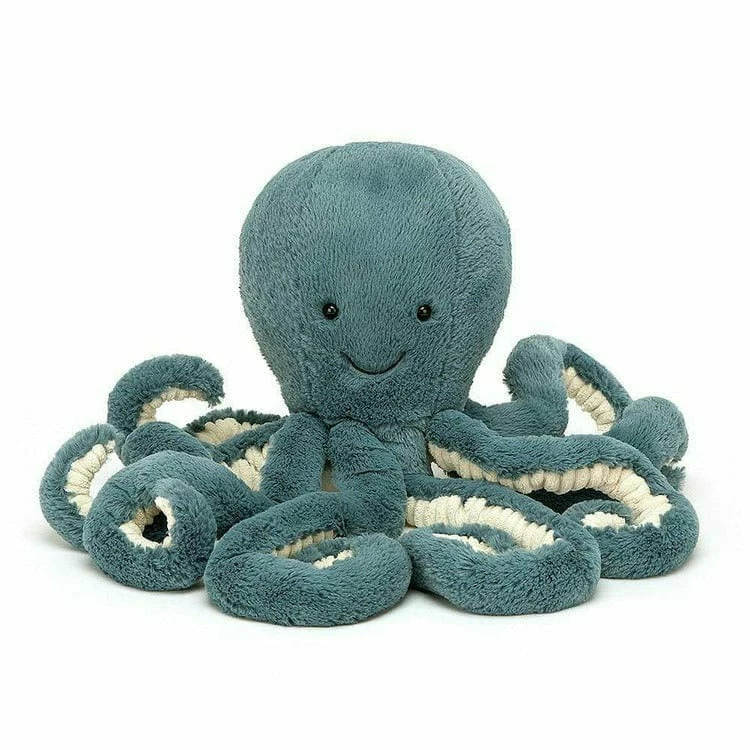 This plush octopus stuffed animal loves having imaginary adventures under the sea. Its sweet smile, friendly face and calming, aquatic blue hue will delight your little ocean explorer. Plus, there are plenty of playful sensory details to experience. Feel the ruffly faux-fur under its eight arms and have fun tugging on them. (Surprise–they’re springy!)