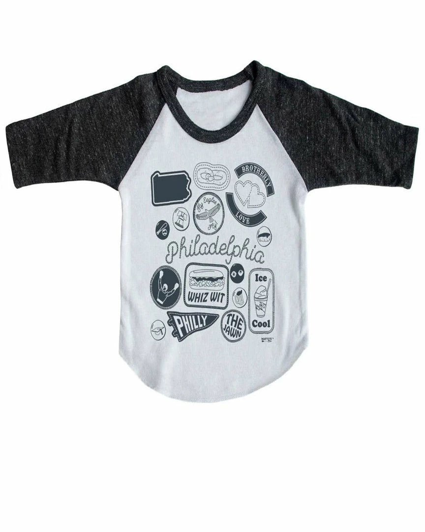 Dress up your little one in this unisex raglan sleeve, baby baseball tee with a whimsical design of patches and pins inspired by Philadelphia, Pennsylvania.