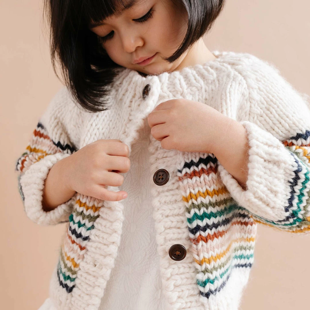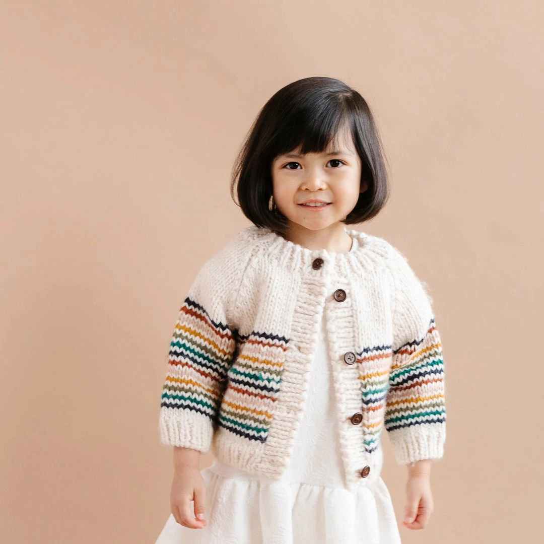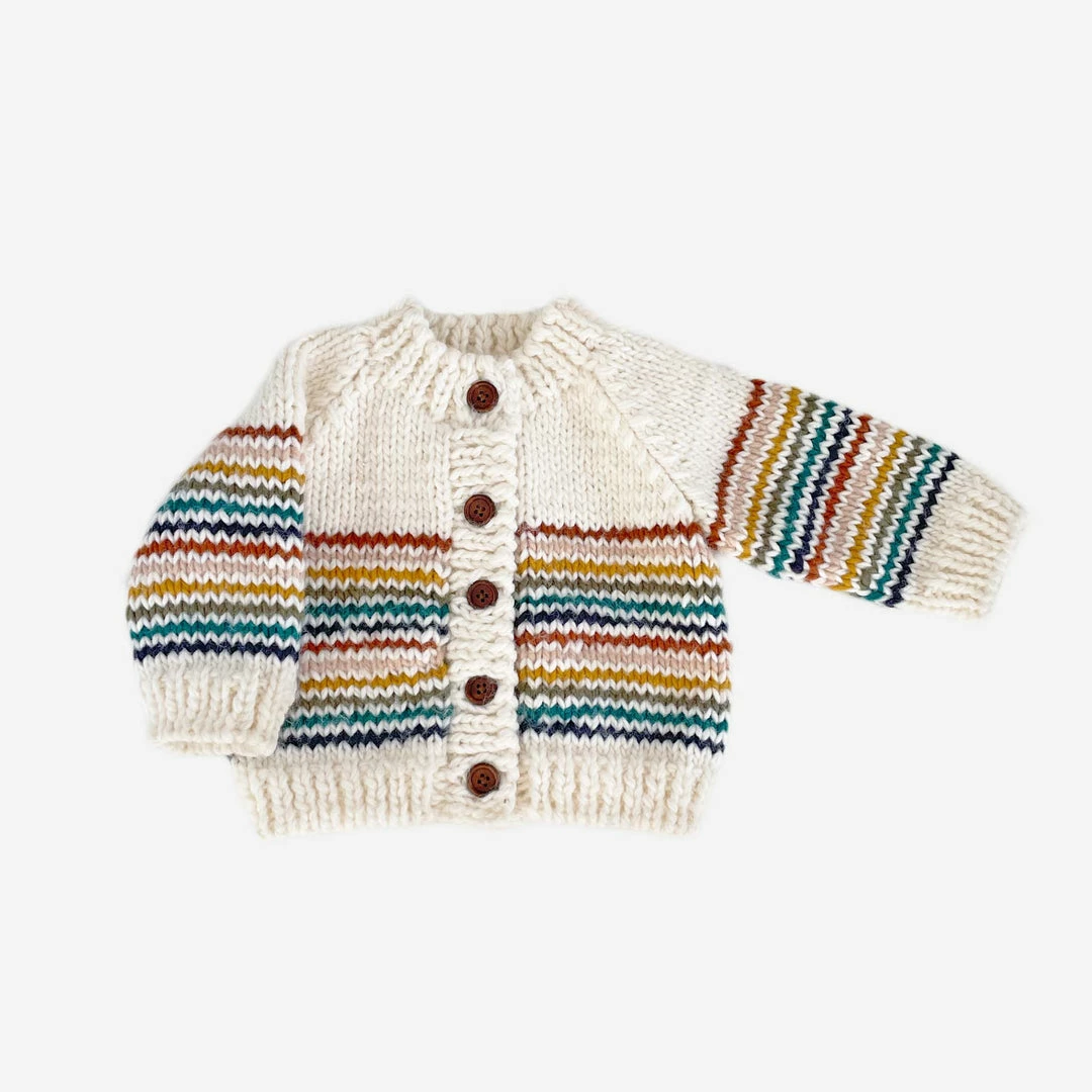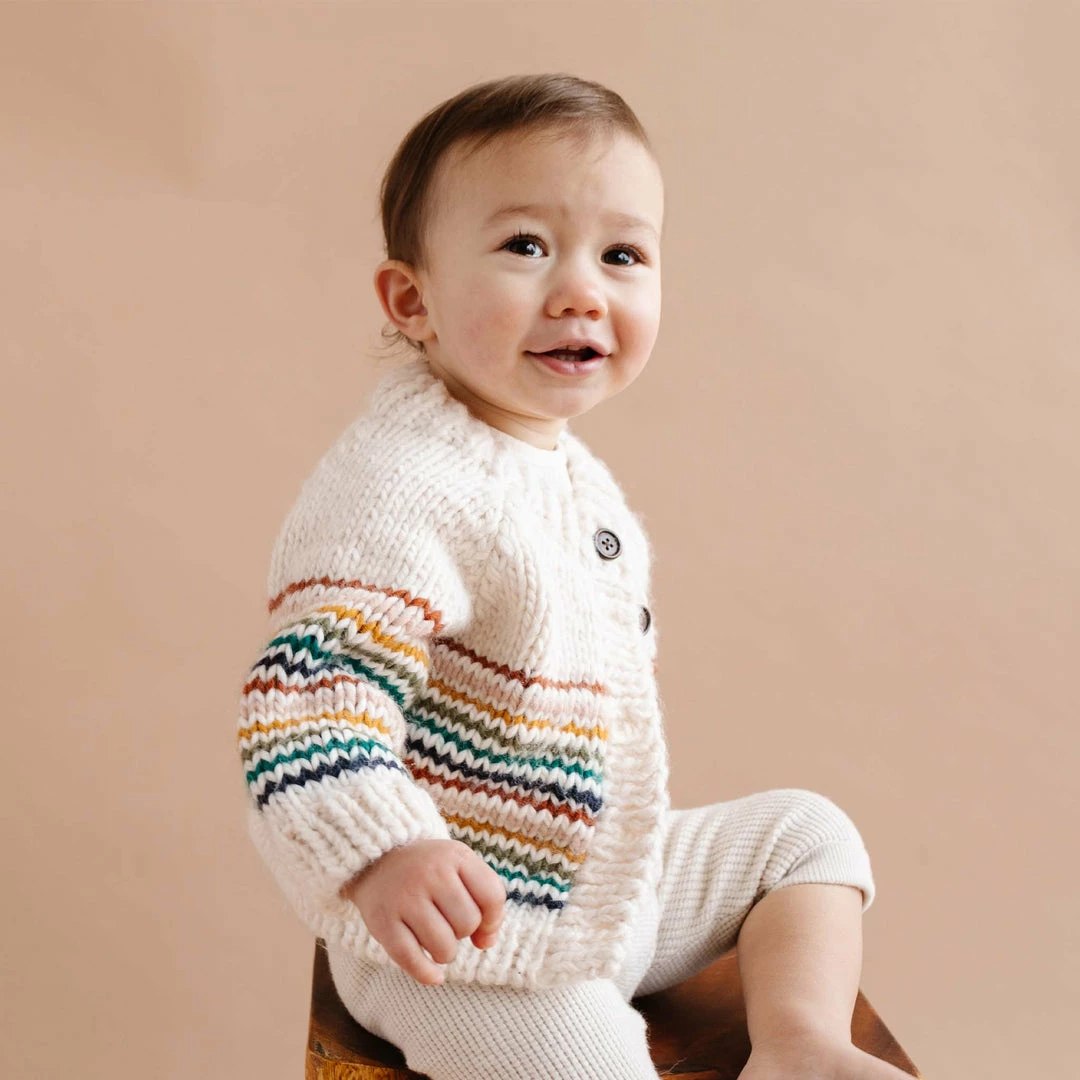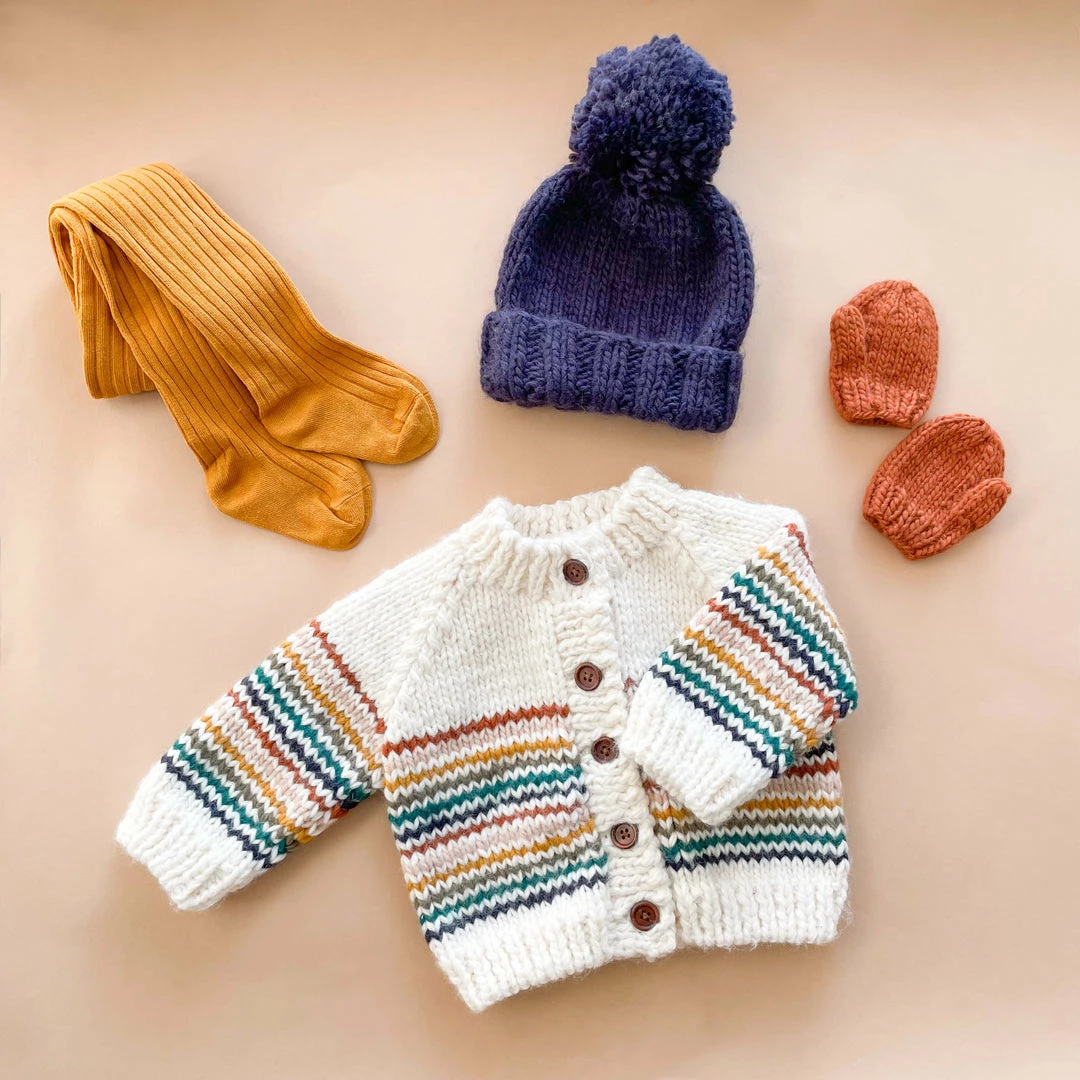 If you want the rainbow, you gotta put up with the rain. Stash away a rainbow of memories in this adorable rainbow striped cardigan. Stripes include Cinnamon, Blush, Mustard, Olive, Teal and Navy. Don’t forget to pair with the matching mittens https://thelittleapplestore.com/products/rainbow-stripe-retro-knit-mittens?_pos=1&_sid=f97b80d59&_ss=r