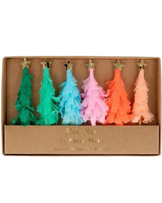 Looking for a little something extra for your party table? How about these fabulous festive Christmas tree picks? They are made from colorful fringed crepe paper, with a fancy gold star on top.