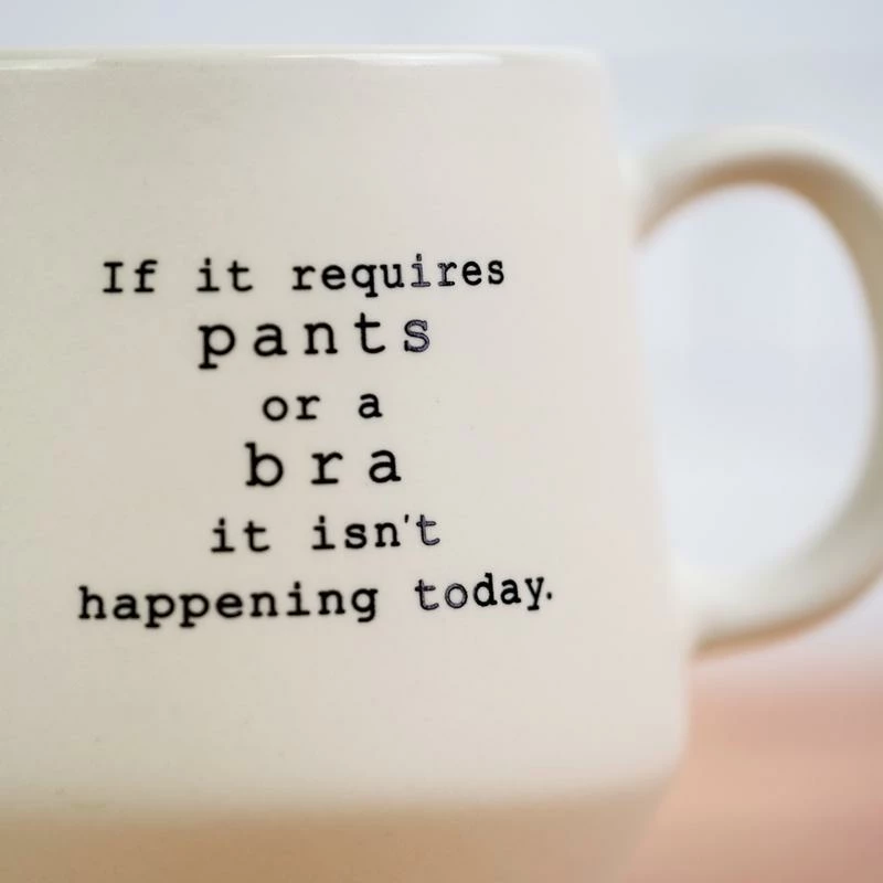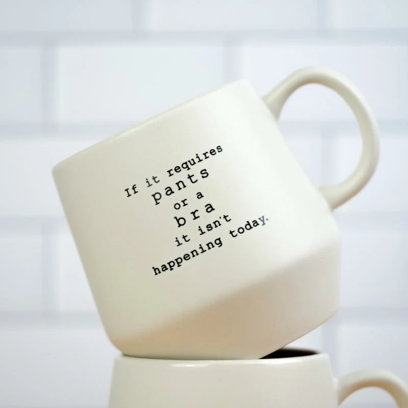 This ceramic coffee mug holds 17oz of glorious morning brew. If it requires pants or a bra it isn’t happening today.