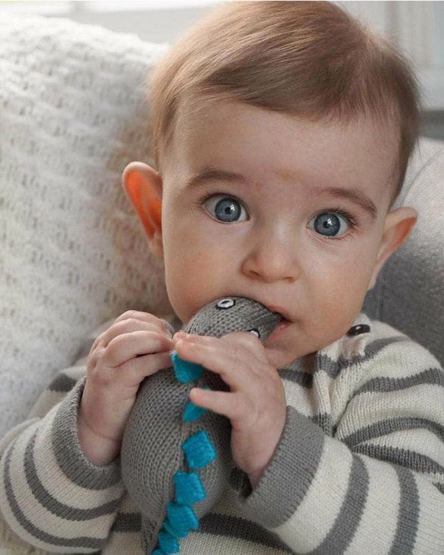 The fascination with dinosaurs is as old as time. Their powerful bodies and awesome presence are mythical. Our stegosaurus organic newborn rattle captures all the love without the roar. Our infant toy is soft and cuddly, just waiting for affection and adventure. Its gentle rattle sound and bright colors are the perfect way to interact with baby until they are ready to engage in imaginative play of their own. This lovable Dino toy is hand knit in Peru from the softest organic cotton. It measures approximately 6.5โ long and is ready to inhabit the nursery, the office or wherever your favorite explorer roams.