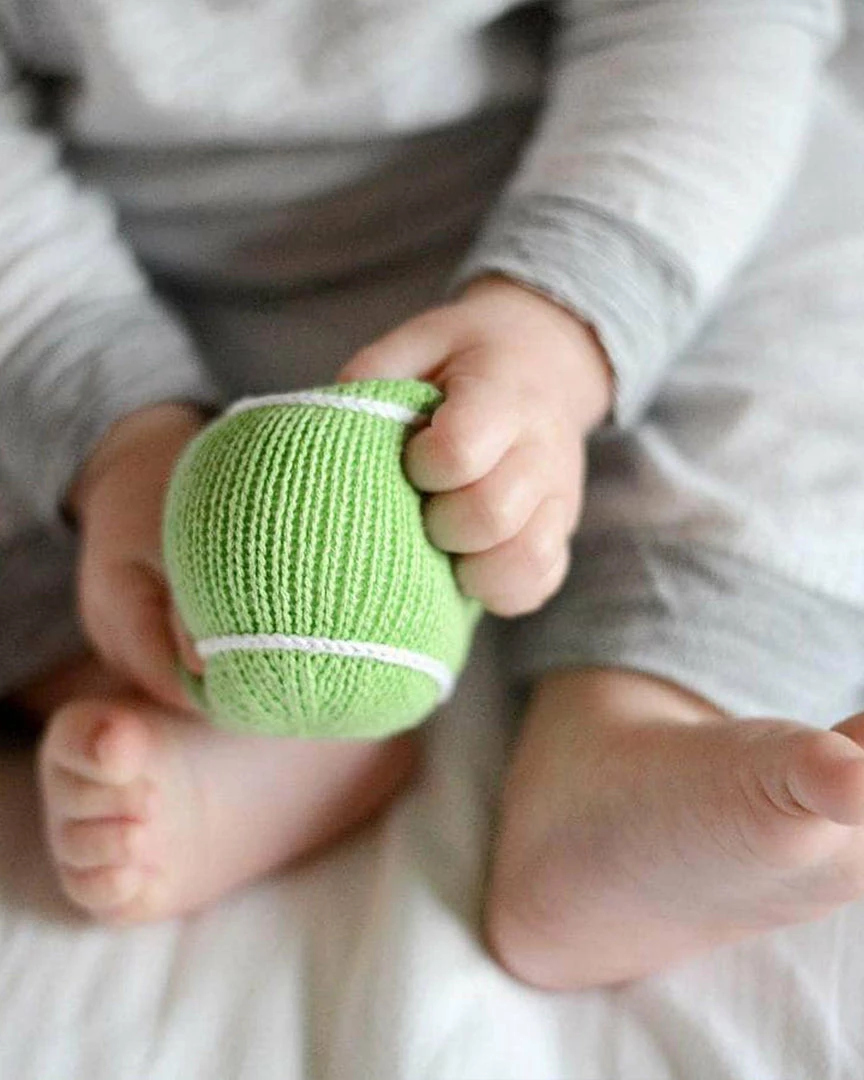 For your future grand slam champ, this organic tennis infant toy will delight little ones with its bright green color, soft tactile cotton, and a gentle rattling sound. As an added bonus, once baby grows up this soft rattle can become a toddler toy to encourage imaginative play.