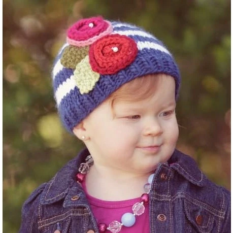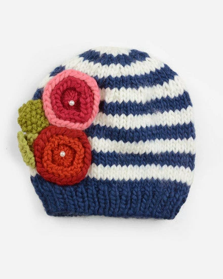 The Bree is a simple and sweet navy and white striped hat with beautiful flowers on the right side. Each flower has a tiny pearl accent. Great for everyday wear.